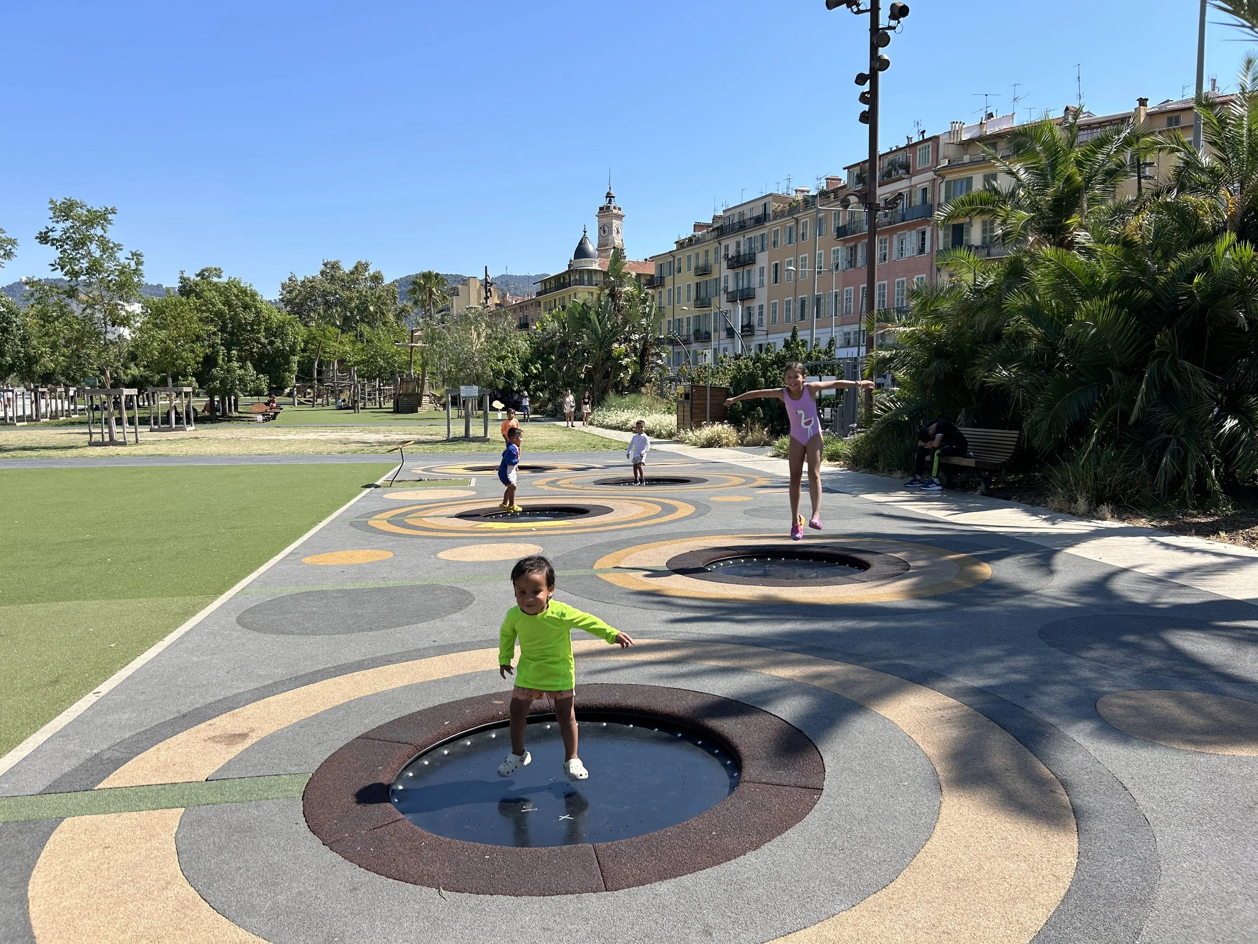 One of the things we were most excited about staying in Nice was spending time on the French Riveria. These beaches always look so gorgeous and dreamy in photos, movies, etc….but no one ever seems to mention that every beach is formed by stones rather than sand! My kids just kept crocs on in the water and seemed unbothered by it, but us adults were dying! It was so painful to try to walk into the water barefoot while the waves pushed up against you. It was very clear who were tourists (those wincing, flailing, and falling into the water) and who were the locals (those with padded swim shoes and yoga mats for the “beach”). We were only in Nice for a few days, so we just suffered through the pain and let kids enjoy themselves!